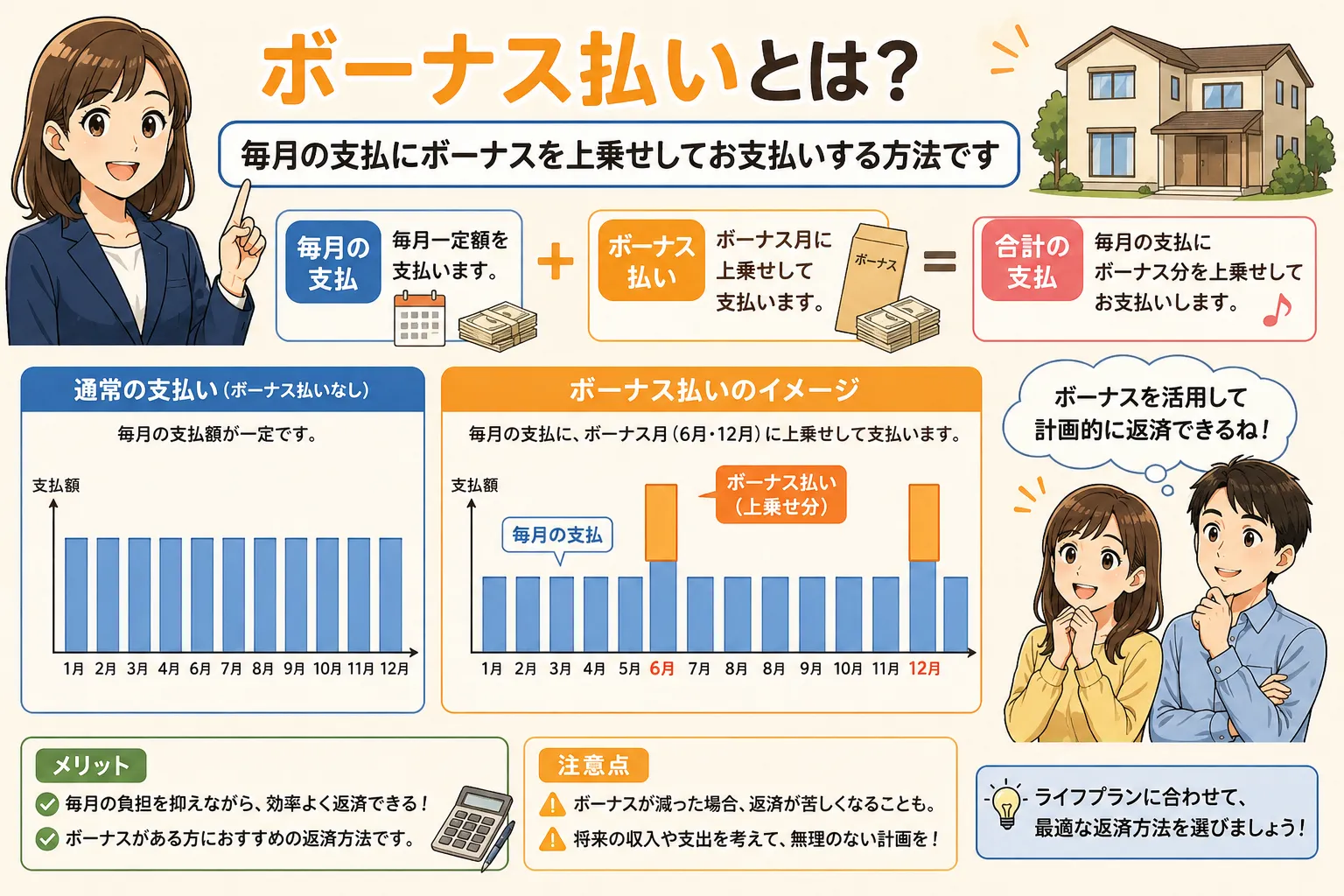 ボーナス払いについての理解は、特に住宅ローンや大きな買い物を検討する際に非常に重要です。多くの人が「ボーナス時に一度だけ一定の金額を支払えば良い」と考えるかもしれませんが、実際にはボーナス払いとはボーナスの時期に通常の月々の返済額に上乗せして支払いを増やす方法です。このような誤解を避けるためには、ボーナス払いの仕組みを正確に理解しておくことが不可欠です。